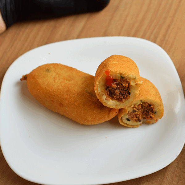 Recheio: Carne bovina moída, cebola branca, batata flocada (Batata, emulsificante mono e diglicerídeos de ácidos graxos, estabilizante pifosfato dissódico, antioxidante palmitato de ascorbila e ácido cítrico, conservante metassulfito de sódio e corante natural de cúrcuma), colorífico (fubá de milho (Agrobacterium tumefaciens, Bacillus thuringiensis e Streptomyces viridochromogenes) e suspensão oleosa de urucum), cebolinha verde, pimenta malagueta, sorbato de potássio e benzoato de sódio.
